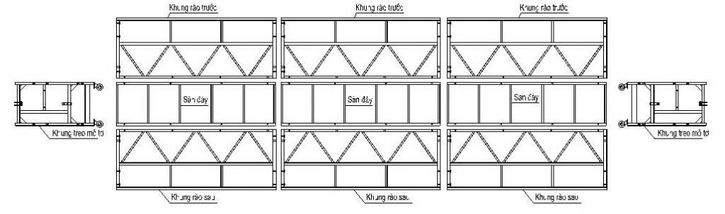 B1: Sử dụng các chi tiết khung rào chắn cao, khung rào chắn thấp, khung treo mô tơ, sàn đáy, bu lông (tương ứng các chi tiết số 22, 23, 25, 24, 26, 27, 28) để ghép nối và lắp đặt thành sàn làm việc với chiều dài tùy sử dụng (tối thiểu 1 mô-đun, tối đa 3 mô-đun). Lưu ý: lắp ráp định hình trước, bắt bu lông gắn “hờ” cho đến khi bắt đủ bu lông, chỉnh định hình lại rồi bắt chặt. Việc ghép nối các khung rào với nhau sử dụng bu lông chi tiết số 28, ghép nối các khung rào với sàn sử dụng bu lông chi tiết số 27. Sắp xếp sao cho khi hoạt động, các khung rào trước ở phía trong các khung rào sau ở phía ngoài so với trạng thái làm việc. Sau khi lắp chắc chắn toàn bộ sàn, sẽ tiến hành lắp ráp bánh xe, bánh tỳ (nếu có)